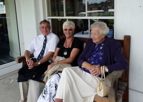 The photo above left shows our Chairman Roger Francis with his wife Ruth, chatting to Trevor Adcock and Peter Hayes, whilst the photo on the right shows singer John Freeman, with his wife Pat holding the Friends Provident Trophy that was on show at the ground.