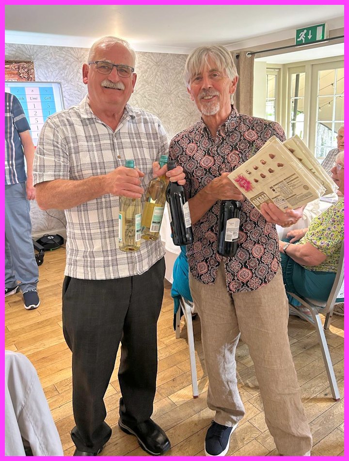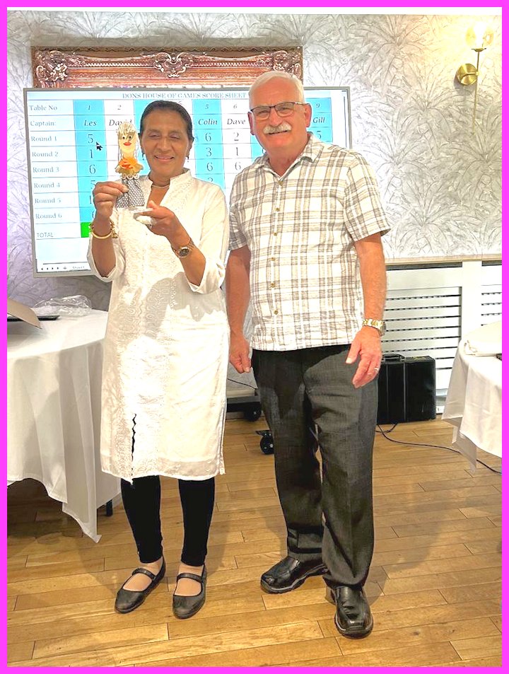 Chairman, Dave Stedman presented the rather ordinary trophy to Les and handed the prizes to the winners. A close second was Table 5, captained by Colin Mockford who also won wine and chocolates. The table that finished last, Table 8, captained by Umi Patel, won the rather adorable hand made wooden spoon people that had been made by Don's granddaughter Charlotte.